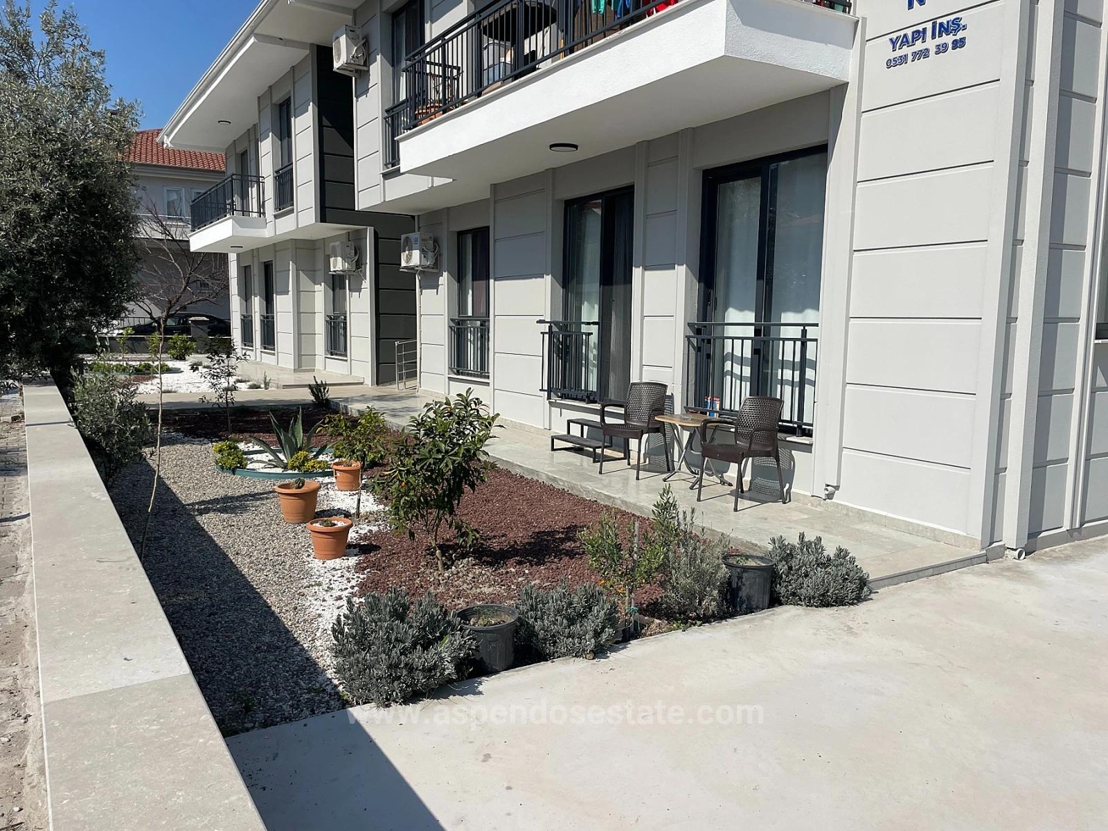 In einem Gebäude mit insgesamt 8 Wohneinheiten auf einem 1000 m² großen Grundstück im Zentrum von Dalyan steht eine Erdgeschosswohnung zum Verkauf. Die Wohnung verfügt über 2 Schlafzimmer, 1 Wohnzimmer mit offener Küche und 1 Badezimmer mit einer Wohnfläche von insgesamt 75 m². Sie ist komplett möbliert. Das Gebäude ist neu und renovierungsbedürftig. Zur Anlage gehört ein Gemeinschaftspool. Einkaufsmöglichkeiten und Supermärkte sind fußläufig erreichbar. Die Wohnung liegt 10 km vom Strand Iztuzu und 25 km vom Flughafen entfernt. Der Preis beträgt 210.000 Euro.