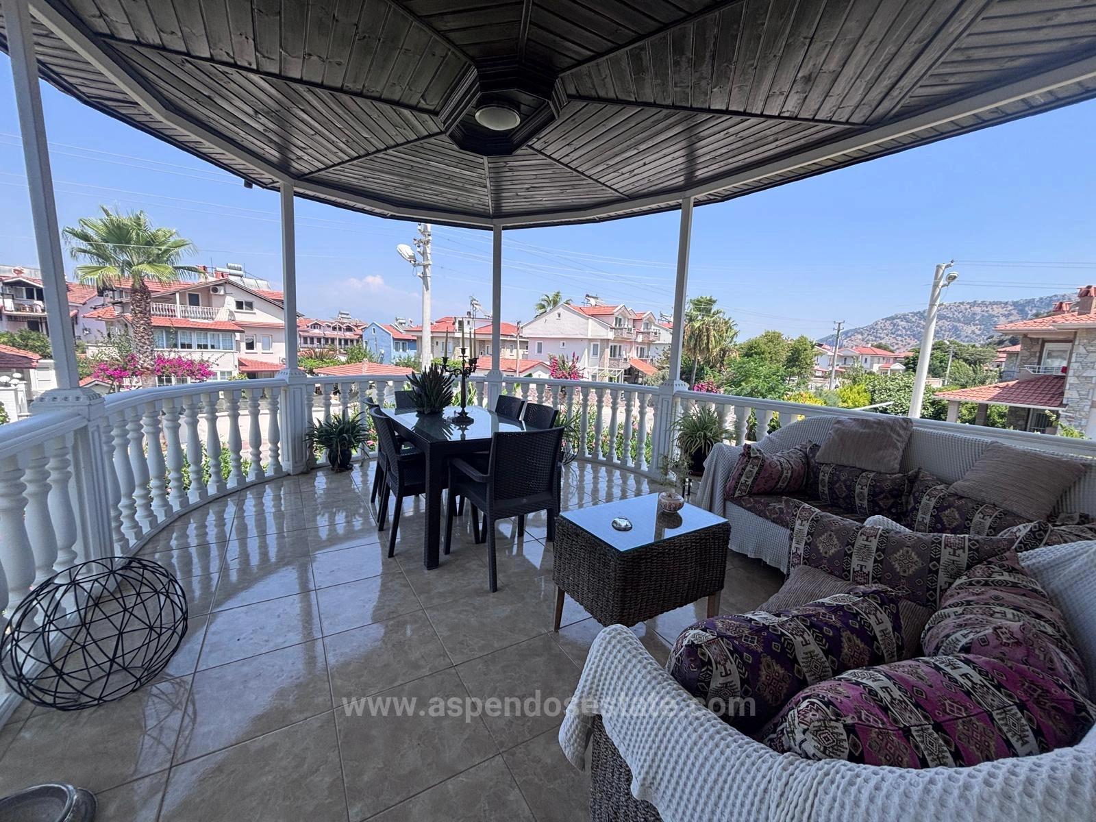 Dalyan Maraş'da köşebaşında 980m2 arsa içerisinde 5 yatak odalı (her biri ebeveyn banyolu), 1 salon açık mutfak, 5 banyolu, müstakil açık yüzme havuzlu villa satılıktır. Havuz tuzlu sistem ve ısıtmalıdır. Full eşyalıdır. Villanın bahçesi meyve, palmiye ağaçları ve zakkum ile peyzaj yapılmıştır. Sessiz konumda olan villa kaya mezarları manzaralıdır. İztuzu Plajı'na 10km, havaalanına 25km, alışveriş marketlerine ve semt pazarına yürüme mesafesinde olan villanın fiyatı: 895.000 GBP
